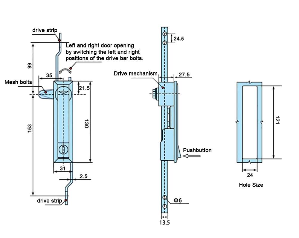 Замок дверей з нержавіючої сталі виготовлений з нержавіючої сталі в оригінальному кольорі з нержавіючої сталі для довговічності та стійкості до корозії. Розмір відкриття - 24 мм × 121 мм, що забезпечує сумісність зі стандартними конфігураціями встановлення.